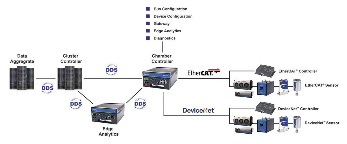 Below is a representative real-world application of the MKS HyperPAC Industrial PC in an IIoT setting. The HyperPAC is employed as a chamber controller that collects data and controls the chamber along with any ancillary instruments using EtherCAT® or DeviceNet™ protocols, processes this data and passes it on to Edge Analytics, cluster controller, and client databases using the DDS communication protocol. It can function as the Fieldbus Master, running recipes and control algorithms, as well as a gateway to higher level controllers or analytics servers via IIoT protocols such as DDS via the MKS SDK. The HyperPAC features 5 Ethernet ports, with DDR4 ECC memory, two SSDs, one removable and one internal. It has an Intel Xeon CPU with C236 PCH that supports Windows®10 IoT Enterprise LTSB, TenAsys INtime Real-time Operating System (RTOS) for Windows. Using system partitioning to support real time control performance, process control and critical applications run under control of the real time OS while the IIoT gateway functions run under Windows control. Furthermore, the MKS SDK provides an interface between the Windows and INtime Processes. The MKS SDK provides the IIoT with a great deal of flexibility. The MKS IIoT gateway runs either an EtherCAT or DeviceNet master that provides data communication by EtherCAT or DeviceNet from device to device. The IIoT gateway in the HyperPAC converts data from EtherCAT or DeviceNet slave networks to DDS for publication to client systems such as Edge Analytics and fab enterprise systems. The EtherCAT Master allows the configuration and management of EtherCAT networks with configurators supporting detection, configuration, and debugging. The MKS IIoT gateway SDK uses a Visual Studio plugin that allows for convenient browsing of online programming documentation, GUI based configuration of DDS QoS settings, code generation, and Visual Studio solution/project creation. The HyperPAC supports configuration tools for streamlined support of fieldbus devices and a Performance Diagnostics Dashboard to facilitate optimal performance.