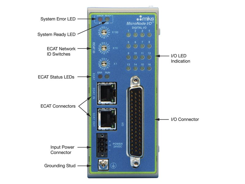 MicroNode™ EtherCAT® Networked Input/Output Controller provides a high density, compact and economical solution for 16 digital inputs/outputs, 8 analog inputs, and 4 analog outputs on the popular EtherCAT network. The 16 digital IO points are sinking, isolated, and can be used as either inputs or outputs. MicroNode™ EtherCAT contains all required object models, connectivity and configuration.