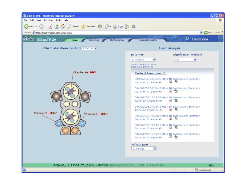 Using TOOLweb RGA sensor integration option for process tools, the 300mm ResistTorr can be used as a degas chamber sensor in a completely automated process environment. TOOLweb RGA maintains a constant monitor of tool activities with all sensor data being framed by wafer logistics before alarm models are applied. Full alarm and data reporting to the FAB host and FDC are available so real time monitoring of chamber conditions and flagging of any process excursions from ideal conditions is possible.