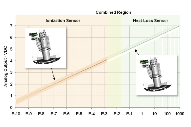 The Series 392 Micro-Ion Plus combines Granville-Phillips® industry-standard and application-tested Micro-Ion ionization sensor with an innovative miniature Pirani Conductron sensor in a single gauge assembly envelope that is attached to a compact electronics control module. This compact modular design reduces the number of separate gauges, vacuum interfaces, cabling and control electronics that are typically required for full range pressure measurement. The full range pressure measurement is output as a single analog signal or is available through optional RS-485, DeviceNet or EtherCAT digital interfaces.