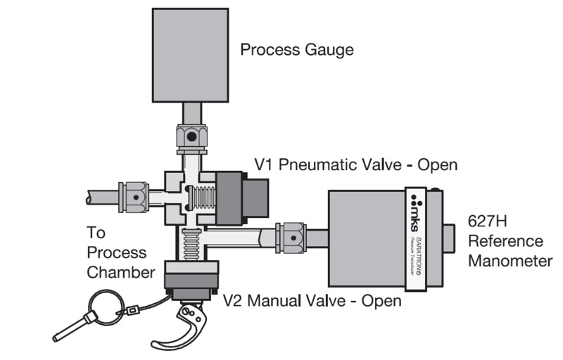 The cart’s pressure standards are removed from its storage drawer and placed near the process tool’s manometer port. This is facilitated by using a combination isolation valve such as the MKS’ IDA™ In Situ Diagnostic Access Isolation Valve. When the pressure standard is connected to the isolation valve’s access port, it can be used to verify the accuracy of the gauge and check the system’s set point pressure.
