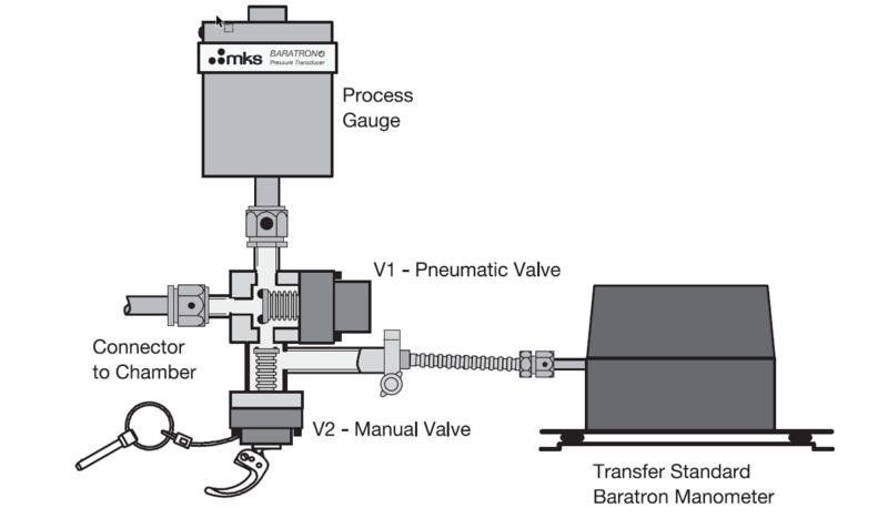 The cart’s pressure standard is removed from its storage drawer and placed near the process tool’s manometer port. This is facilitated by using a combination isolation valve such as MKS’ IDA™ In Situ Diagnostic Access Isolation Valve. When the pressure standard is connected to the isolation valve’s access port, it can be used to verify the accuracy of the gauge and check the system’s set point pressure.
