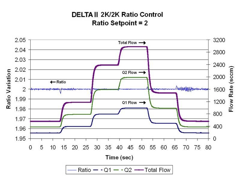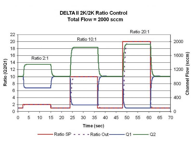 The DELTA II has a wider dynamic ratio control range and is more adaptive to different tool and process conditions. MKS has developed a unique patent pending ratio control algorithm enabling ratio and flow response times of less than two (2) seconds. This control algorithm also enables a twenty to one ratio control range, more than double its industry leading predecessor.