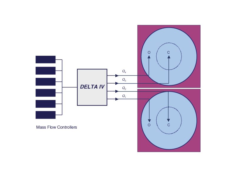 The DELTA IV has a wide dynamic ratio control range and fast development of chamber flow while being adaptive to different tool and process conditions. MKS has developed a unique patent pending ratio control logic enabling rapid ratio and flow response times. This control logic enables the total input flow to be split with channel flows ranging from 2 to 100% of the channel Full Scale for measurement and control purposes. The total of all channel flows shall be split in such a way that their sum equals 100%. For example the flows may be split to 10, 20, 30 and 40% of total flow input going to channels Q1, Q2, Q3 and Q4, respectively. The dynamic control also allows for individual channels to be given 0% set points which closes the valve, effectively closing off flow to this output.