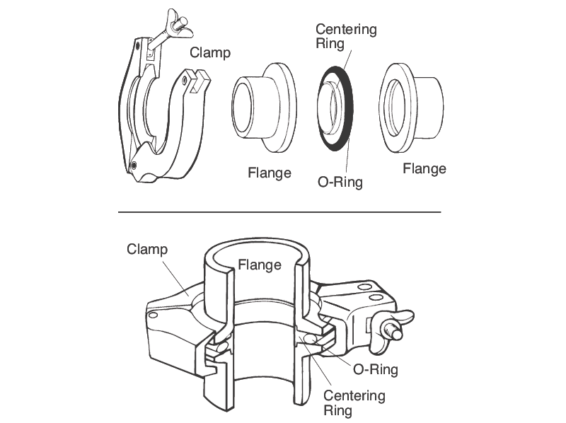 The ISO-KF components are assembled by inserting a centering ring between the two flange faces, then securing the assembly with a flange encompassing clamp.