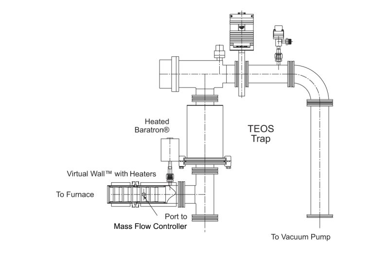 Our TEOS process traps when used as one element of a TEOS Effluent Management Subsystem™, have proven very effective in reducing particulates and increasing uptime. TEOS traps collect TEOS byproducts, preventing them from backstreaming into the furnace and contaminating the pump. In test cases, a greater than 20% reduction in particulates has been recorded.