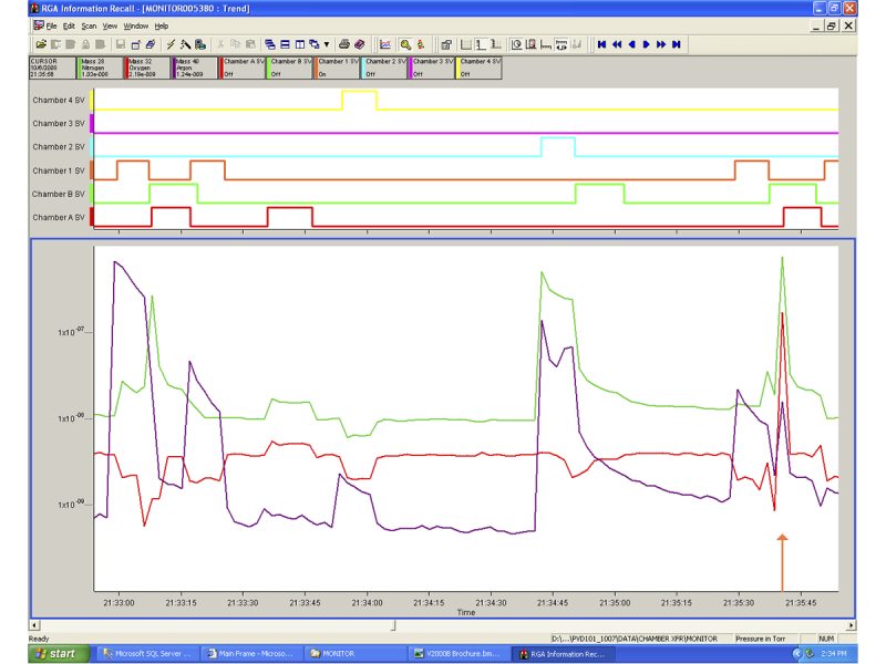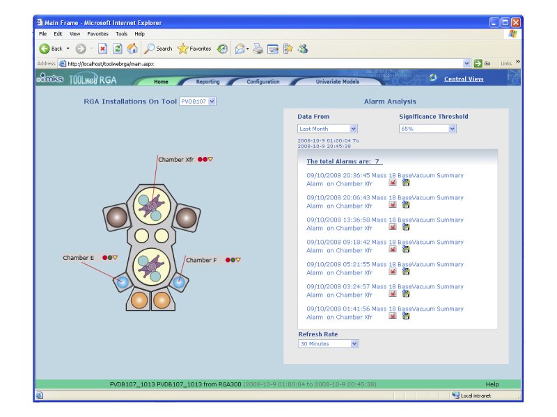 Using TOOLweb RGA sensor integration option for process tools, the Vision 2000-B can be used as a transfer, buffer or loader chamber sensor in a completely automated process environment. TOOLweb RGA maintains a constant monitor of tool activities with all sensor data being framed by wafer logistics before alarm models are applied. Full alarm and data reporting to the FAB host and FDC are available so real time monitoring of chamber conditions and flagging of any process excursions from ideal conditions is possible.