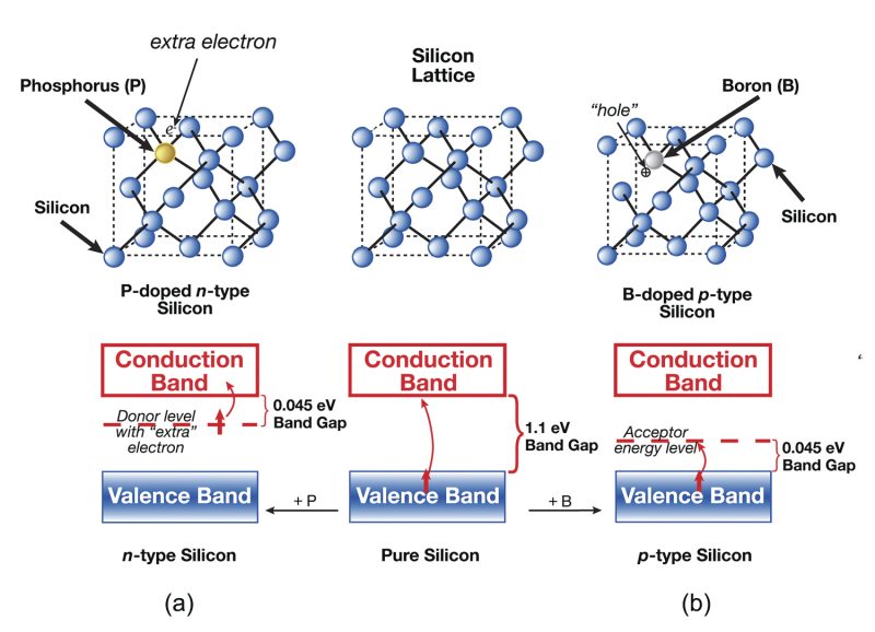 When compared with metals, semiconductor electrical conductivities are not very high, as can be seen from the values in Table 1. However, semiconductor conductivities can be significantly increased (and, in fact, fine-tuned to target values) by adding impurity atoms known as dopants. “Doped” semiconductor materials are commonly referred to as extrinsic semiconductors. Figure 4 shows the area of the Periodic Table that contains the elemental semiconductors and the dopant elements that can be used to create an extrinsic semiconductor. The dopants are those elements on either side of Column IVA in the Periodic Table. A dopant atom is similar in size to the intrinsic semiconductor atom in the same row but has either one fewer or one greater electron in its valence shell. The dopant atoms can easily replace the semiconductor atom in its crystal lattice. Figure 5 shows the insertion of either a Group VA (n-type dopant, phosphorus) or a Group IIIA (p-type dopant, boron) atom into the silicon crystal lattice as well as the effect that the substitution of the silicon atom by a dopant atom has on the band structure of the silicon.